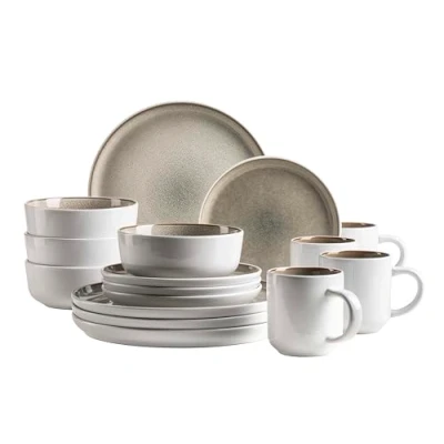 The tableware set includes 4 dinner plates each with 26 cm diameter, dessert plates with 20 cm diameter, bowls with 15.5 cm diameter and coffee mug with handle (360 ml) The ceramic crockery made of high-quality stoneware offers everything you would expect from a modern tableware set: impressive look, easy-care material, versatile in everyday life as well as for entertaining guests. The exceptional, shiny reactive glaze ensures unique colour gradients and harmonises perfectly with the plain exterior in cream tone. No matter breakfast, lunch or coffee and cake in the afternoon: plates and bowls with harmonious, modern coup shapes offer plenty of space for serving any food. DURABLE HIGH QUALITY DINNER SERVICE - The sturdy tableware is easy to clean and suitable for dishwasher and microwave.