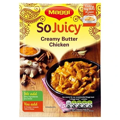 Maggi So Juicy Butter Chicken 41g is a convenient, no-artificial-flavours cooking mix that creates a rich, aromatic butter chicken dish using traditional spices and herbs. Ready in minutes, it’s ideal for a tasty meal with minimal effort—just add chicken and enjoy.