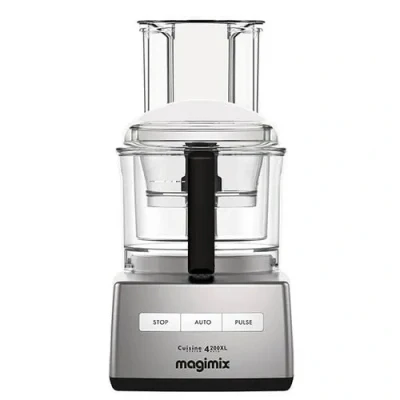 Ideal for families, the Magimix 4200XL Food Processor in satin is perfect when catering for up to 6 people. The 4200XL food processor can knead up to 2 loaves (1kg) or grate up to 1.4kg of vegetables in the main bowl.SIMPLE TO USE - With just three buttons (stop/auto/pulse) the motor of the Magimix food processor automatically adjusts the power according to what’s in the bowl for effortless food preparation. Along with a recipe book and free Magimix app, the 4200XL is supplied with everything you’ll need to blend, chop, slice, grate, knead, whisk and store your accessories.BUILT BETTER TO LAST LONGER - The Magimix 4200XL is supplied with a 3 year parts guarantee, backed by a dedicated and reliable customer service team whilst the powerful, ultra-quiet commercial grade induction motor is covered by an unbeatable 30 year guarantee. Magimix food processors are also approved by the Good Housekeeping Institute.QUIET MARK - Magimix food processors are the first in their category to be awarded the Quiet Mark. The UK Noise Abatement Society charitable foundation encourages companies to prioritise noise reduction when designing their products. The Quiet Mark is the international approval award given to products that successfully achieve this criteria.4200XL CAPACITIES - Bread dough - 1kg; Pastry - 1.2kg; Blending - 1.3L; Chopping (meat) - 1kg; Grating (carrots) - 1kg; Egg whites: 6.Main bowl: 3L. Midi bowl: 2.6L. Mini bowl: 1.2L.POWER - 950w.ACCESSORIES INCLUDED - Extra-large feed tube, triple pusher, stainless steel blade, BlenderMix, dough blade, egg whisk, 2mm slicing / grating disc, 4mm slicing / grating disc, spatula, storage box, recipe book.DIMENSIONS - Height: 425mm x Length: 210mm x Depth: 260mm.WEIGHT - 10.8kg.