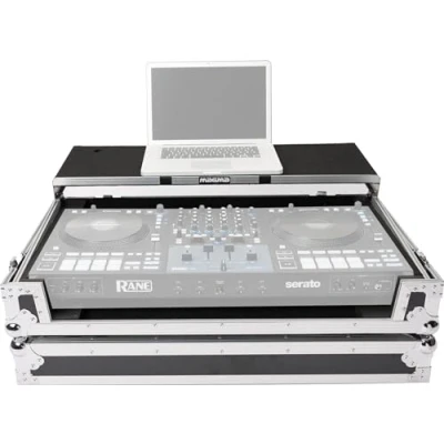 Rugged custom-fit flight case for Rane Four DJ controller with wheels Heavy duty construction of 9mm vinyl laminated plywood Solid aluminum profiles and spring loaded latches, and gliding laptop platform (removable) Recessed wheels for easy transportation, and fully padded interior keeps controller well-protected Detachable front cover/panel, and solid rubber feet