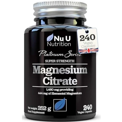 POWERFUL FORMULATION - Our Nu U Platinum Series offers premium food supplements at an exceptional price point. Our Magnesium Citrate, is a high potency and bioavailable Magnesium supplement which delivers 1480mg of Magnesium per serving, providing you with 444mg of Elemental Magnesium. Our magnesium capsules offer a quick and convenient daily serving and are designed to be easier to swallow than regular magnesium tablets due to their lozenge shape. BEST VALUE - We are confident that we will not be beaten on price or quality! Our Magnesium Citrate supplement gives amazing value for money, providing 240 capsules per bottle. Keeping you replenished with a high strength, natural magnesium supplement for 4 months. Most supplements are only offering 180 capsules per bottle, so why pay more for less? MIGHTY MINERAL - Magnesium is a mineral required by every organ within our bodies and is used in many functions. Magnesium plays a particular role in contributing to the reduction of tiredness and fatigue*. If we do not have enough Magnesium in our diets we can feel sluggish. It also helps to contribute to a normal energy-yielding metabolism* supporting the release of energy by the body so you can feel prepared for the day ahead *as substantiated by the European Food Safety Authority. VEGAN FRIENDLY - Our formulation is suitable for those who follow a vegetarian or vegan diet. We never use GMO ingredients and can ensure our capsules are also free from any nasty, artificial ingredients, preservatives and allergens such as egg, milk, lactose, soya, gluten, wheat and peanuts. No hidden nasties here! PLATINUM RANGE NEXT LEVEL SUPPLEMENTATION - At Nu U Nutrition your health is important to us. Our research and development team have spent over 12 months developing a range of world-class supplements using only the finest ingredients and most bio-available formulations that are backed by scientific and clinical studies. We do all this because we believe in your health and a Nu U.
