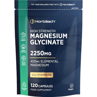 HIGH STRENGTH SUPPORT: Each daily serving has been formulated to deliver the equivalent of 2250mg of Magnesium Glycinate providing 450mg of Elemental Magnesium. MIGHTY MINERAL: Magnesium Glycinate is known for its high bioavailability and gentle effect on the digestive system, making it the better choice for those looking to increase their magnesium intake. EXPERTLY CRAFTED: Our professional formula is backed by our commitment to purity and potency. SUITABLE FOR: Horbaach Magnesium Glycinate tablets are vegan and free from artificial colours, flavours, or preservatives. It's the perfect formula for adult men and women at the best value. Please be aware that our tablets may contain naturally occurring black marks. These marks are a result of the natural ingredients used. They do not affect the quality, safety, or efficacy of the product. PACKAGING MAY VARY: We are in the process of updating our packaging. If the product you receive appears different, please rest assured that the benefits remain the same.