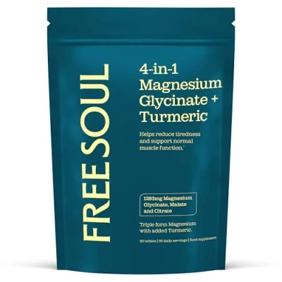 πππ©ππ‘πππ π πππ‘ππ¦ππ¨π πππ¬πππ‘ππ§π β Our unique blend combines 3 powerful forms of Magnesium (Glycinate, Citrate and Malate 1,322mg, 385mg elemental) with 2,000mg of high-strength Turmeric (50:1 extract & 95% curcuminoid). Formulated to support normal muscle function, contribute to the reduction in tiredness and fatigue, and support normal energy levels. πͺππ§π π£π¨π₯π π§π¨π₯π ππ₯ππ β Each serving contains 2000mg of the highest-quality Turmeric Root Extract. This concentrated extract, combined with Magnesium, boasts a range of powerful benefits. Our Magnesium supplements are designed to provide comprehensive support. π§ππ₯πππ‘ππ¦π¦ ππ‘π πππ§πππ¨π β Our 4-in-1 Magnesium Glycinate + Turmeric supplements are perfect after a long day and can play a helpful part of a healthy sleep routine. It also supports the normal function of your nervous system & contributes to the reduction of tiredness & fatigue. πππ©ππ‘πππ ππ₯π¨πππ§π¬-ππ₯ππ ππ’π₯π π¨ππ β Our Magnesium & Turmeric tablet supplements are made in the UK, developed by leading nutritionists and independently tested to ensure the highest quality and purity. At Free Soul weβre committed to clean, premium formulations - vegan, gluten-free, dairy-free and cruelty-free. Your wellbeing is our priority, so you can trust our products to deliver the nutrients you need - without compromise. ππππππ ππ¬ π¦ππππ‘ππ, ππ’π©ππ ππ¬ πππ β Free Soul 4-in-1 Magnesium Glycinate + Turmeric has been formulated to support your bodyβs unique needs.Itβs designed to complement your routine, helping you feel balanced and refreshed every day. ππππ©ππ§π π¬π’π¨π₯ π₯π’π¨π§ππ‘π β whether youβre working out, recovering from daily activities or simply looking to supplement your magnesium or turmeric intake, our Magnesium and Turmeric complex is the perfect solution. Free Soulβs Magnesium Glycinate Supplement has been carefully crafted to support you from a range of different angles including normal muscle function and normal energy yielding metabolism and is an ideal supplement to include in your night time routine. ππππ ππ’π§π§ππ ππ’π‘π§πππ‘π¦ π΅π¬ π§πππππ§π¦