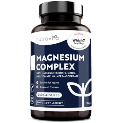 Why Nutravita's Magnesium Complex? - Discover the power of magnesium, with a carefully developed formula and high potency. Each daily serving of 2 high strength magnesium capsules provides 400mg of elemental magnesium, consisting of a combination of 5 high-quality types of magnesium, including: Magnesium Citrate, Magnesium Bisglycinate, Malate & Ascorbate & Magnesium Oxide. Our Magnesium capsules are a great alternative to magnesium glycinate tablets, powder, or oil spray. Why Take Our Magnesium? – Magnesium is also called "the mighty mineral" because the cells in our body depends on magnesium in regulating day-to-day metabolic reactions to help in the process of cell division and protein synthesis, to facilitate proper muscle and nerve function, and in maintenance of normal bones and teeth. Claims substantiated by EFSA (European Food Safety Authority). Boost your wellbeing with 240 easy-to-swallow, vegan capsules per bottle, offering a 4 month supply. How Does Magnesium Help Athletes, Runners, and During Exercise? – The role of magnesium especially during strenuous physical activities of people who train or work out on a daily basis is essential as minerals including magnesium are lost when we sweat. As substantiated by EFSA, intake of magnesium helps in the reduction of tiredness and fatigue, and in the maintenance of electrolyte balance and normal energy-yielding metabolism. Rated Which? Best Buy 2025 - Our high-strength Magnesium Complex supports normal muscle and nerve function, energy release and the reduction of tiredness and fatigue. Formulated with 5 premium forms of magnesium, it’s ideal for everyday wellbeing and active lifestyles and was rated Best Buy in October 2025 as Magnesium supplements by Which?. What Is The Story Behind Nutravita? - Nutravita is a recognised and trusted Vitamins & Supplements brand providing thousands of customers across the world since 2014. Our high quality products are manufactured, batch tested and certified in the UK, and safeguarded by the highest manufacturing standards in the world (GMP, BRC). We have a dedicated team of pharmacologists, chemists and research scientists working to source the finest and most beneficial ingredients.