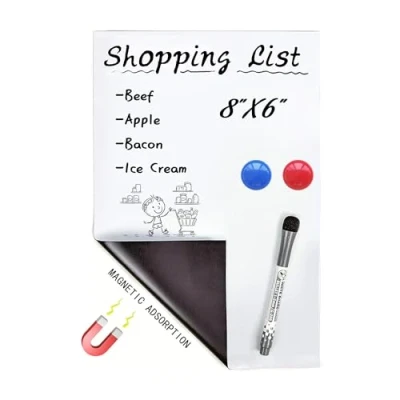 【Rich Combination】:The whiteboard set includes an A5 magnetic whiteboard, a multi-function magnetic marker pen and two Magnets. These accessories can be attached to metal surfaces for easy writing, note-taking and drawing 【Stable】:This A5 magnetic whiteboard has strong magnetism. It does not require glue or tape, and can be easily fixed on smooth metal surfaces without wrinkling or slipping. But it is not suitable for non-magnetic stainless steel refrigerators 【High-quality materials】:The magnetic dry erase board adopts upgraded PET material. The surface of the board is smooth, which is not only easy to draw and write, but also not easy to deform and scratch 【Multiple Uses】:This fridge whiteboard magnetic can be used to make to-do lists, meal plans, lesson plans, shopping lists, etc. It is perfect in the kitchen, office, classroom. You can also cut it into different sizes and shapes for personalized use 【Good Choice】:If you want to keep your life organized, this magnetic whiteboard for fridge is a good choice. You can also give it to your friends or children, allowing them to plan every day in the future and enjoy a better life