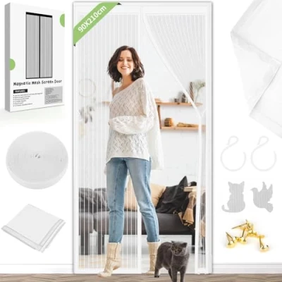 Magnetic Fly Screen Door Curtain Curtains 90X210cm for Doors with Powerful Magnets and Full Frame Magic Tape, Nets Without Drilling, Suitable Patio Balcony Bedroom(White)