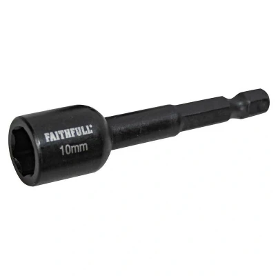 General description The Faithfull Magnetic Impact Nut Driver is specifically designed for use with high torque impact drivers. It features a magnetic hex socket that simplifies the setting and removal of bolts and nuts, making it ideal for repetitive tasks. Technical specifications Size: 10mm Shank: 1/4 inch Hex Length: 65mm Compatibility and accessories Compatible with impact drivers that accept 1/4 inch hex shanks Installation Insert the nut driver into the impact driver’s chuck until it clicks into place Usage Use for tightening or loosening bolts and nuts in various DIY and home improvement projects Ideal for repetitive tasks requiring quick setting and removal of fasteners