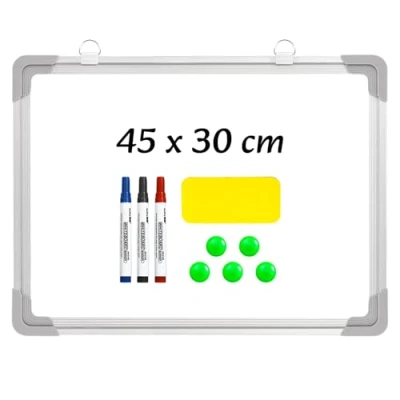 Magnetic dry-wipe whiteboard with an overall size (incl. frame) of 45 x 30cm. Easy-to-clean double side writing surface with eraser included. Robust aluminium trim and pen tray. Perfect notice board for home office, schools or meeting rooms. The board also comes with 3 markers, 6 magnets and eraser