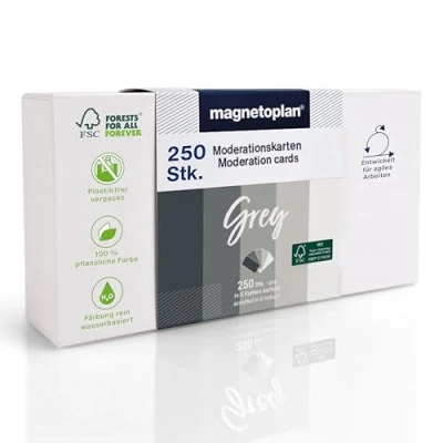 Sustainable communication cards for meetings, presentations and discussions 250 temperance cards in the grey color palette: with 5 unique colors 20 x 10 cm index cards for notes, learning or visualization High-quality workmanship with precisely cut edges, made from 120gsm paper Made from 100% FSC wood, coloured with oil-free plant based paint.