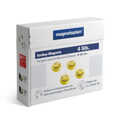 Freche Dekoration: Mit diesen Smiley-Magneten setzen Sie kreative Akzente | Ideal für Büro und Zuhause | Sorgen stets für gute Laune und dekorieren stilvoll jede eisenhaltige Fläche Magnettafelmagnete: Nutzen Sie die starke Haftkraft von 7 Blatt A4 für Ihre Magnettafeln | Halten Sie Notizen, Pläne, Rezepte und Zeichnungen sicher und dekorativ an ihrem Platz Vielseitig: Perfekt auch als Kühlschrankmagnete | Diese Magnete haften auf eisenhaltigen Oberflächen und schmücken Kühlschränke, Whiteboards, Büros, Kinderzimmer und mehr Lieferumfang: 4 Smiley-Magnete ideal für den Einsatz im Büro und Privatbereich