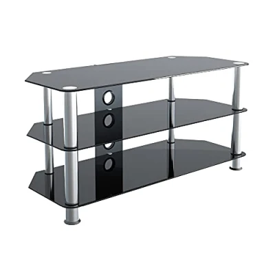This sound bar friendly, classic black glass TV stand with optional cable managment will allow you to create a focal point with your TV and AV equipment. Simple design and minimum tools required, with easy to follow instructions for a quick and stress free assembly Ample space provided with three high gloss black tempered safety glass shelves, and polished stainless steel legs. Suitable for TVs up to 50 inches. While the maximum size recommendation allows for some overhang of the TV, it's important to measure your TV's base footprint to make sure it is compatible with the stand. UK Design with a UK based helpline should you need us!