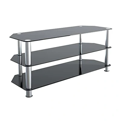 This sound bar friendly, classic black glass TV stand will allow you to create a focal point with your TV and AV equipment. Toolless design and simple easy to follow instructions for a quick and stress free assembly Ample space provided with three high gloss black tempered safety glass shelves, and polished stainless steel legs. Suitable for TVs up to 55 inches. While the maximum size recommendation allows for some overhang of the TV, it's important to measure your TV's base footprint to make sure it is compatible with the stand. UK Design with a UK based helpline should you need us!