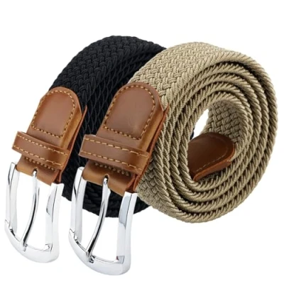 maikun Braided Elastic Stretch Woven Belt with Leather Tip Nickle Pin Buckle Black Khaki