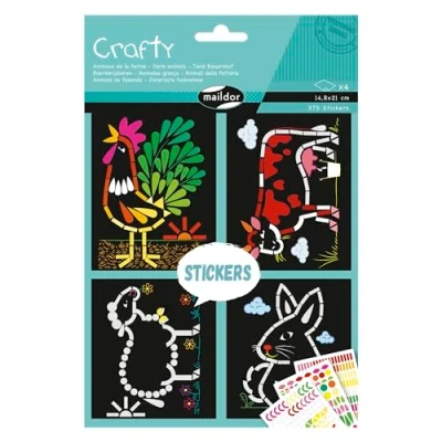 CREATIVE KIT: children decorate the 4 black decors with multi-coloured geometric stickers. Allows them to develop their creativity, imagination and dexterity. 4 BLACK DECORS 14.8x21 cm: to highlight the stickers applied by the child. 3 GEOMETRIC Stickers BOARDS: these are large enough for small hands to grasp easily. REPOSITIONABLE: children can move their stickers to modify their creations without tearing them. CONFORMS TO CE STANDARDS. Number of stickers: 359.