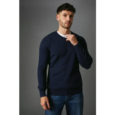 Cotton Cable V-neck Jumper from Maine. Smart in style and designed with the softest fabrics, discover this statement men's V-neck jumper today. Featuring long cosy sleeves with stretch cuffs, a modern V-neckline, and a tailored cut finish for the perfect fit. Crafted from 100% Cotton. Wash at 40. Model wears a Size M.