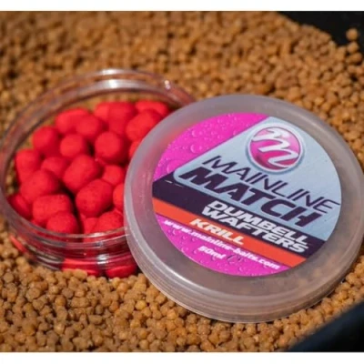Mainline Match Dumbell Wafters - Available in 2 flavors - Diameter: 6mm - Ideal for use with a Banded Hair Rig - Semi-floating - Optimal presentation - Easily absorbed by fish - Perfectly balanced with a Guru size 12 QM1 hook The easy-to-use Dumbell Wafters offer the angler a sophisticated bait presentation combined with strong attraction. The 6mm Dumbell Wafter is perfect for use with a Hair Rig, giving you a bait that is critically balanced with a size 12 QM1 hook from Guru. The semi-floating nature of these baits relieves the weight of a hook and ensures that the hook is presented in a way that gives you the best chance of getting bites. The balanced buoyancy of these baits means that they are easily sucked up by fish, “wafting” into the mouths of fish sucking up feed far away from your feeder.