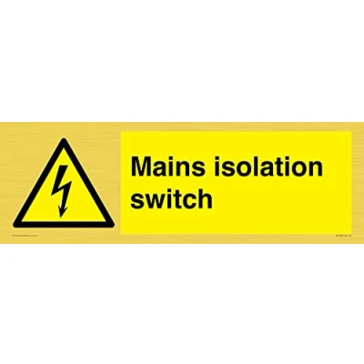 W012 : Electricity This sign is made from vinyl gold sticker Gold metal effect sticker for flat, clean surfaces. Not for rough, plastic, or dusty surfaces. 62 landscape Sign Text: Mains isolation switch
