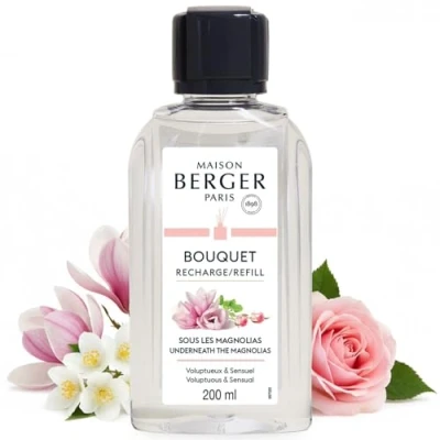 PERFUME BOUQUET REFILL: This Bouquet Sous les Magnolias refill is intended to be used with one of Maison Berger Paris scented bouquets, available to purchase separately. It creates a feminine and fruity atmosphere, a true olfactory journey at home. This fragrance, ready to use, is continuously diffused by your Maison Berger Paris reed bouquet diffuser. FRAGRANCE: Under the Magnolias is a pure balance of floral and citrus notes, ideally rounded by woody scents. Top notes: Bulgarian rose, lemon. Middle notes: Arabian Rose, Blue Flamboyant Peach, Black Jasmine. Base notes: Patchouli, Amber, Musk. Directions for use: Fill your scented bouquet with the refill and immerse the sticks in it. Turn your strands regularly to reactivate the fragrance. To decrease the intensity of the fragrance, you can remove a few strands. Change your strands with each new fragrance. A GREAT CHOICE OF DIFFUSERS AND FRAGRANCES: Maison Berger Paris scented bouquets are original creations, developed in France by our perfume experts. Our fragrances come in a wide variety of subtle scents, to create as many olfactory, flowery, fruity, oriental or gourmet atmospheres! PERFUMER EXPERT FOR MORE THAN 120 YEARS: Maison Berger Paris has been combining tradition and modernity since 1898, with the invention of the Berger lamp, which has become over time THE iconic reference for home fragrance throughout the world. Our ranges have continued to be enriched with new, innovative and timeless creations, thanks to a unique know-how and a quest for excellence constantly renewed.