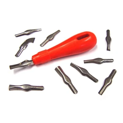 Features a red handled lino cutter with ten assorted nibs – each nib with a different profile Designed with an interchangeable head which takes all ten of the cutters which are included with this set Handle length: 87mm (approx.), Cutter length 40mm (approx.) Perfect for all lino craft work and is also used in woodcarving and pottery Pack contains 1 handle and 10 cutter nibs