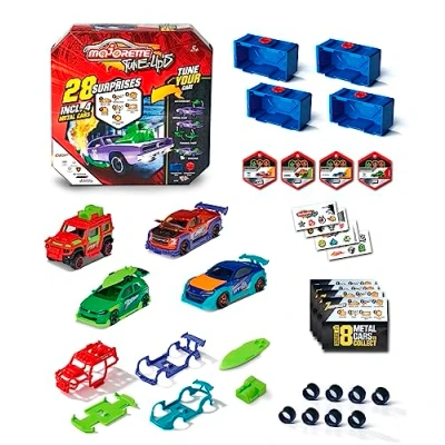 Majorette Tune Ups powered by GRIP - the engine magazine. Large spoilers, powerful body kits, wider tyres and exciting stickers - in each set of 4, 28 surprises are waiting for little tuners and car fans to be installed directly. Four of 18 collectable cars are included in each set 18 exciting models in different variants of Lamborghini Urus, VW Golf, Toyota GT86, Renault Megane R.S., Toyota Hiace, Suzuki Jimny and Ford F-150 Raptor are available. Find the ultra rare Toyota GT86 with high-quality matte/chrome paint, glitter body kit, wider tyres and rims in two colours Ideal gift - Whether for ambitious collectors of model cars or for boys and girls aged 5 and up, the realistic and licensed models are the perfect gift for young and older car fans. The unboxing and tuning experience ensures extra varied fun Strong features - The 7.5 cm long cars with metal body feature freewheel, suspension, interior, partially opening parts and become a real eye-catcher with the tuning accessories XXL box contents - 28 surprises: 4 x metal toy cars, 4 x tuning attachments (body kit), 4 accessories, 4 x collection boxes for stacking, 4 x collectible chips for exchange, 4 x collectible flyers and 4 x sticker sheet, Manufacturer: Majorette