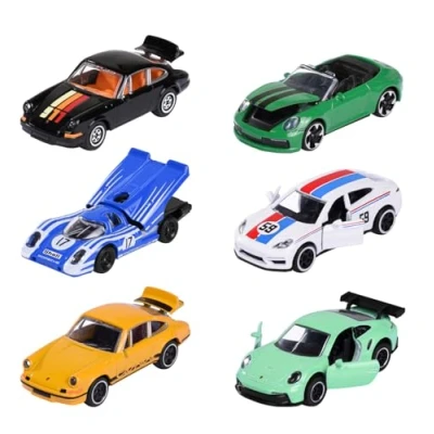 Porsche model true to the original - Each of the 6 metal cars has been detailed and of superior quality with an official license from Porsche on a scale of 1 64. Attention when ordering, you will receive 1 car Random selection of 6 Porsche cars (7.5 cm each) — 1. 911 Carrera S green, 2. 917 blue, 3. 911 Carrera RS 2.7 black, 4. 911 Carrera RS 2.7 yellow, 4. 911 Carrera RS 2.7 yellow, 5. 911 GT3 Cup (992) turquoise, 5. Panamera blanc To play and collect - The sturdy toy cars of the edition Majorette Porsche are suitable as a toy for car fans from the age of 3 and as a gift for small and large model car collectors. An eye-catcher — All 6 car models are equipped with freewheels, parts that can be opened and have an eye-catching appearance — among others with Vaillant, Brumos & Gran Turismo (Sony) prints. Trading card included - For the ultimate fact check and car comparison, each model has a matching trading card with exciting information about speed, cylinder count, torque Note! This product comes from the manufacturer in the form of a varied assortment of models and/or colors. It is impossible for us to offer you any of these specific models and/or colors, so you will receive one of them at random (subject to availability)., Manufacturer: Majorette