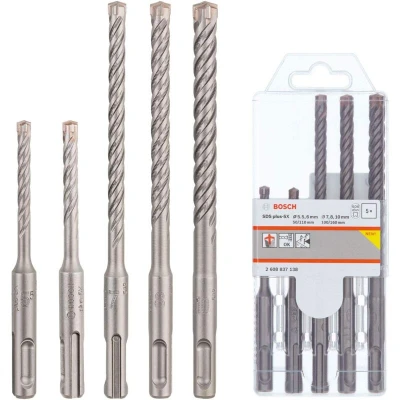 Bosch 2608837138 SDS-Plus drill bit set 5.5mm to 10mm 5pce features: Bosch 2608837138 SDS-Plus drill bit set these 5x drills have been designed and manufactured to give tradesmen superb drilling through concrete, sizes of this set are 5.5mm, 6mm, 7mm, 8mm and 10mm. Features in the Design of these Bosch SDS-Plus drills include a centre tip that guides the drill at the start reducing the tendency to walk gives more accurate drilling, a geometrical Form of the 4 cutter head designed to prevent jamming and breakage during loaded drilling plus fast stock removal and increased drilling speeds due to the 4 flute drill Design Features Bosch SDS-plus-5X drill bits are specially designed with a centring tip for active and accurate centring in concrete. They have a 4-cutter geometry that prevents jamming in rebar and the drill bit tip does not break off. They have a 4-flute design for fast dust removal giving higher drilling speeds and longer life. Centring tip for active and accurate centring