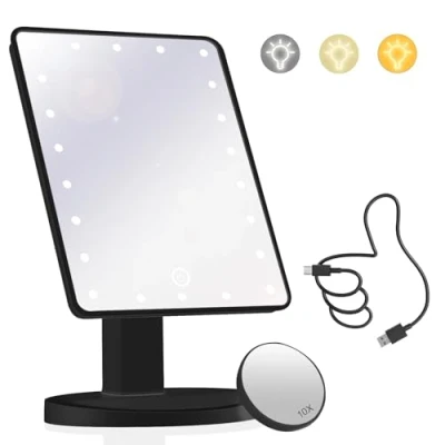 UPGRADED 22 LED LIGHTS: Equipped with high-intensity 22LED lights, this mirror provides a clear and even reflection, ensuring optimal visibility in any lighting condition. Led lights on/off controlled by the touch sensor switch and long press can adjust lights brightness, allow you makeup in the dark or poorly lit areas. The light is natural and soft, protecting your eyes. SMART TOUCH SCREEN & 3 Color: This vanity mirror features a high-sensitivity touch screen sensor design that has a longer life than traditional mechanical buttons. By touching the button, you can turn the mirror on or off, adjust the brightness of the LED light and color. 10X/1X MAGNIFICATION MODES: 1x for regular makeup, The small detachable 10X round magnification mirror allows you to see every detail very clearly to make a more perfect makeup for precise facial makeup such as eyelashes, eyebrows, cheeks, etc for excellent use experience. DUAL POWER SUPPLY & 360-Degree Rotation: The LED travel mirror is powered by 4 AA batteries (not included) or USB cable (include). Please NOTE: The light up mirror can't rechargeable and it cannot store power. Enjoy the freedom to rotate the mirror 360 degrees, providing a full range of angles for a detailed view of every aspect of your face. PERFECT GIFTS: The light up travel mirror is an ideal gift for mother, sister, wife, girlfriend, makeup artist, etc. on Valentine's Day, Mother's Day, Christmas, anniversaries or other special occasions