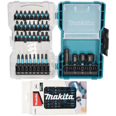General description Makita's 36 Piece Impact Black Screwdriver Bit Set is designed for impact drivers, featuring a high durability range suited for professional use. The set includes a variety of screw bits and nutsetters, all recognized by a unique black coating that prevents rusting and enhances longevity. Technical specifications Set includes 30 Impact Black screw bits and 3 E-form nutsetters 24 x 25mm screw bits: PH1, 4 x PH2, PH3, PZ1, 3 x PZ2, PZ3, T10, T15, 3 x T20, 3 x T25, 2 x T40 8 x 50mm screw bits: 2 x PH2, PZ2, 2 x T20, 2 x T25, T30 ¼” hex 60mm magnetic bit holder 3 x E-Form nutsetters: 8mm, 10mm, and 13mm Other information Complete with a clear cover case Impact Black screw bits are 20% more durable than standard screw bits
