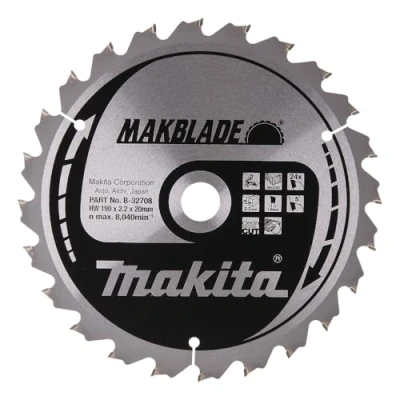 General description The Makita B-32708 MAKBLADE Mitre Saw Blade is designed for precision cutting with a focus on durability and efficiency. Its high-grade tungsten carbide construction ensures a low wear rate, providing an extended blade life while maintaining sharpness. Technical specifications Blade Diameter: 190mm Bore: 30mm Kerf: 2.2mm Thickness: 1.6mm Rake: 5° Tooth Count: 24 Compatibility and accessories Compatible with both mains and battery powered mitre saws Usage Ideal for precision cutting in various materials Thin kerf design reduces waste and motor pressure