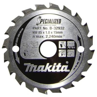 85mm diameter, 1mm kerf, 15mm bore, 20 teeth, 0.7mm thickness and 10 degrees rake Suitable for cordless saws for cutting wood Ultra thin blade Constructed from precision honed, high grade carbide, Manufacturer: Makita