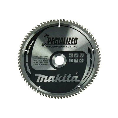 General description The Makita B-33386 Specialized Aluminium Saw Blade is designed for exceptional cutting performance in aluminium, copper, brass, bronze, and other non-ferrous metals. It is also suitable for working on plastics and laminated wood. Technical specifications Blade Diameter: 260mm Bore: 30mm Kerf: 2.8mm Rake: 0º Thickness: 2.2mm Tooth Count: 80 Compatibility and accessories Compatible with portable saws Compatible with mitre saws Compatible with table saws Installation Easy to install on compatible saws Usage Ideal for cutting aluminium and other non-ferrous metals Can be used for plastics and laminated wood