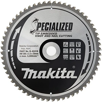 305mm diameter, 2.3mm kerf, 30mm bore, 60 teeth, 1.8mm thickness and 5 degrees rake Suitable for Mitre Saws for cutting wood/nails Tip embedded or “deep tooth” Constructed to master knotty wood, Weight: 2.624 pounds, Manufacturer: Makita