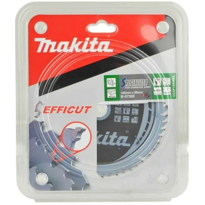 Makita TCT Saw Blades are circular tension blades that can absorb impact, yet still remain flat and true. These blades are light in weight with high grade tungsten carbide prolonging the blades life span. Efficut blades are specialized for cordless tools and cut 2.4 times more than a normal blade, per charge. They also cut 2.5 times faster. The shape also increases the efficiency of released waste. This blade is best used on Wood MDF Laminate. Features Long lasting.Efficut blades cut 2.4 times more than normal blades. Efficut blades are 2.5 times faster than normal blades. Best efficiency means extended battery life and run time Fine cut saw blade Suitable for cordless tools. Perfect for the new Makita DSP600ZJ.Premium ""Specialized"" saw blades made especially for cordless sawsUltra-thin, perfectly tensioned steel plates for true run Precision honed tungsten teeth Up to 25% more cuts and cutting speed when compared to a standard blade