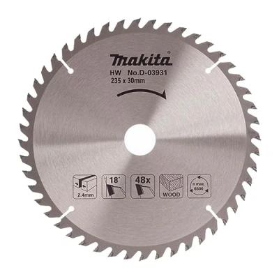 AmazonGood cutting performance at low cost Fine cut Tungsten carbide tipped teeth Suitable for applications including woodworking, carpentry, joinery Diameter 235mm, Kerf 2.3mm, Bore 30mm, Tooth count 48, Thickness 1.6mm, Rake 20 degrees Cross cut and rip cut, Weight: 1.3007273458 pounds, Manufacturer: Makita