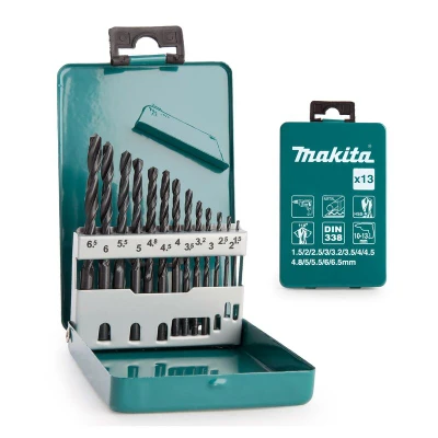 General description The Makita D-54075 HSS-R Bit Set includes 13 highly efficient drill bits designed for drilling applications in various materials such as steel, cast-steel (both alloyed and unalloyed) with a tensile strength of up to 900 N/mm², grey cast, malleable cast iron, die-cast metal, iron sinter, nickel-silver, graphite cast iron, short chipping aluminium alloys, bronze, brass, and hard plastics. This set is ideal for professionals and DIY enthusiasts looking for precision and versatility in their drilling tasks. Technical specifications Sizes: 1.5, 2, 2.5, 3, 3.2, 3.5, 4, 4.5, 4.8, 5, 5.5, 6, and 6.5 mm Material: HSS-R (High-Speed Steel - Rolled) Tensile strength: Up to 900 N/mm² Right-hand cutting twist drill bit Shank diameter: Equal to drill bit diameter Conforms to DIN 338 Standards Other information