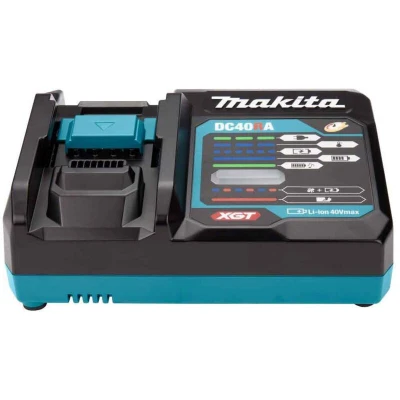 General description The Makita DC40RA Fast Li-ion Charger is designed for charging Makita XGT 40Vmax Li-ion batteries. It can also charge LXT Li-ion batteries using the ADP10 interchangeable adaptor. The charger features dual cooling fans for efficient operation and an improved charging indicator for clear status updates. Technical specifications Battery Range: 40V Battery Type: Li-ion Average Charging Time: 2.0Ah - 22 min, 2.5Ah - 28 min, 4.0Ah - 45 min, 5.0Ah - 50 min Power Supply Cord: 2m Dimensions (L x W x H): 156 x 210 x 84 mm Weight: 1.0 kg Other information Equipped with two cooling fans for optimal charging Full charge melody notification sound can be selected Special electronics for digital communication between tool, battery, and charger