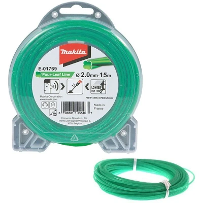 General description The Makita E-01769 Brush Cutter Grass Trimmer Nylon Line is designed for low noise operation, making it perfect for use with cordless brush cutters and line trimmers. Its unique Four-Leaf shape reduces air resistance, allowing for increased efficiency and work amount per charge. Technical specifications Length: 15m Diameter: 2.0mm Compatibility and accessories Compatible with DUR181 line trimmer Suitable for other Makita Brush Cutter Grass Trimmer models