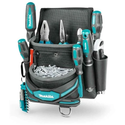 General description This Makita E-05131 2 Pocket Fixings Nail Screw Tool Belt Pouch Holder Strap System is designed for convenience and efficiency. It features a main pocket with anti-slip webbing and real leather holders for screwdrivers and blades. The D-ring allows for hanging various tools and accessories, making it an essential addition to your toolkit. Technical specifications Material: Real leather and high-quality polypropylene Thickness of leather: 1.8 to 2.0 mm Cushioning: Extra thick 20 mm Weight distribution: Heavy Load Support System Compatibility and accessories Compatible with all Makita tool pouches, holders, bags, and cases Can be used as a replacement shoulder strap for various Makita bags Tool loops available in 3 pack (E-05309) or 6 pack (E-05315) Installation Easy to attach and detach with adjustable chest strap and metal hooks Loop Clip Solution for secure attachment to belts Usage Wear on shoulder or hips for easy access to tools Designed to reduce fatigue and