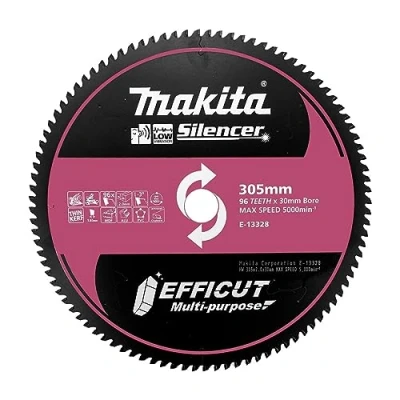 TCT EFFICUT saw blades suitable for Mitre Saws Suitable for cutting aluminium Blade tip design improves the cutting efficiency and durability Reduced cutting resistance Optimal chip ejection Diameter 305mm, bore 30mm, kerf 2mm, plate 1.65mm, 96 teeth, -3 degree rake Tooth configuration SMTCG Pack quantity 1, Manufacturer: Makita