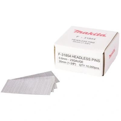 General description Makita F-31854 23G x 35mm Galvanized Headless Pin Nails are designed for use with the DPT353 and PT354D models. These nails feature a smooth shank and are galvanized for enhanced durability, making them ideal for various applications in woodworking and construction. Technical specifications Gauge: 23 Length: 35mm Shank: Smooth Quantity: 10000 Compatibility and accessories Compatible with Makita DPT353 and PT354D models Other information Standard Equipment: 1x Makita 23G Galvanized Headless Pin Nails 10000Pcs