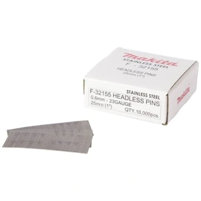 Fast discrete fixing Stainless steel 23G headless pins Ideal for upholstery, laminate, vaneer, skirting boards, architrave and more Suitable for use with Makita DPT350 and DPT353 Stainless steel finish 0.6mm diameter Length 25mm Smooth shank Pack quantity 10,000, Weight: 1.15081300764 pounds, Manufacturer: Makita