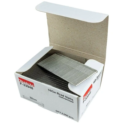 General description Makita F-33948 1mm x 32mm Galvanised 16 Gauge Brads are designed for use with AF600, AF601, and DBN600 nailers, providing a reliable fastening solution for various DIY and home improvement projects. Technical specifications Gauge: 16 Length: 32mm Shank: Smooth Quantity: 2000 pieces Compatibility and accessories Compatible with Makita AF600, AF601, and DBN600 nailers.