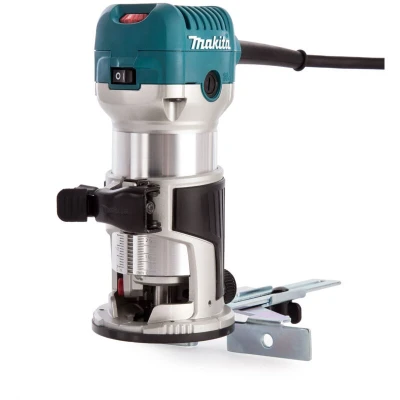 AmazonIncludes trimmer base Flat top for stability when changing bits Aluminium body housing and base Accepts 6mm and 8mm collets, 1/4" And 3/8" Collets Shaft lock for easy bit changes Soft start, variable speed control dial and rocker type on/OFF switch Smooth rack and pinion fine depth adjustment system for precise settings Quick release cam lock system for convenient depth adjustments and base removal and installations Base can be removed quickly to install other bases Connectable to Makita vacuum cleaners, Weight: 2.20462262 pounds, Manufacturer: Makita