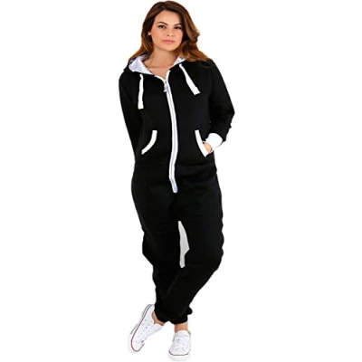 MALAIKA ® Womens Plain Zipper Onesie Ladies Onepiece All in One Hooded Zip Up Overall Plus Sizes Jumpsuit Playsuit Small 5XL (UK 8 UK 22) Black