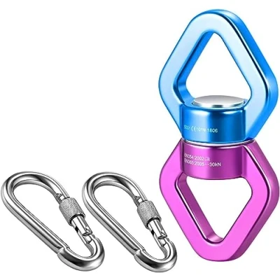 HIGHEST QUALITY SWIVES:Totally Silent, Frictionless 360°Free Rotation with Sealed Ball Bearings,Very Compact and Symmetrical Swivel.Solve rope / webbing twisting and tangling problem when load is turning or spinning.And Wide eye openings of 2 buckles support multiple carabiners and triangular shape, preventing rope or loads from slipping or moving INDUSTRIAL-GRADE SWIVEL DESIGNED: Aluminum Magnesium Alloy, Strong and Durable.30kN (1000 lbs.) Breaking Strength Tested, 2,000lbs.Recommended Working Load Limit.Sealed stainless steel ball bearing enables the rotator to easily sustain any high speed rotation.All pass CE and EN certification. GREAT CHOICE TO UPGRADE FOR ALL KINDS OF RIGGING AND HANGING: For Using with Static and Dynamic Ropes Placed Between a Load and Either Rope or Cable, Can Be Rotated 360 degree, and The Rope Does Not Twist Knot,Two Snap Hook can help Opens and closes smoothly as the spring- loaded gate makes it easy to attach important items to it, allow quick connect/dis-connect of ropes, chains and straps. WIDE APPLICATION - Designed for for various rigging, hanging, climbing, rescue, aerial dance, yoga and Aerial workers, safety lines, Aerial riggers, indoor and outdoor rock climbing etc STEEL BALL BEARING - Sealed stainless steel ball bearing enables the rotator to easily sustain any high speed, silent, frictionless 360° free and flexible rotation. It will work smoothly and won't occur the bad situation such as poor whirl, stuck FEATURE - Double-triangle design can accommodate multiple carabiners, balanced force can prevent twisting and tangling of ropes and lines with strong and smooth 360° rotation or need to stop your climbing ropes from kinking, hockling and twisting. SCREW LOCK CARABINERS: Come with 2 antirust snap hooks whose manual screw gate reduces chance of open-gate failure. And don't have sharpe points that can cut rope like others do.