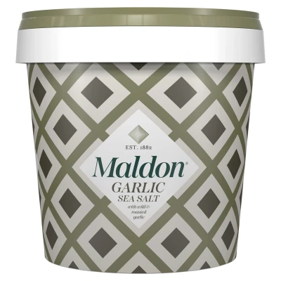 Maldon Sea Salt Flakes With Garlic 500g are premium pyramid-shaped sea salt flakes expertly blended with wild and roasted garlic, offering a fragrant, savoury flavour perfect for seasoning potatoes, chicken, fish, or any dish. Hand-harvested in the UK, this versatile salt elevates everyday cooking.