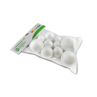 3x polystyrene balls 5 cm. 2x polystyrene balls 6 cm. 2x polystyrene balls 7 cm. 2x polystyrene balls 8 cm. 1x polystyrene ball 10 cm.