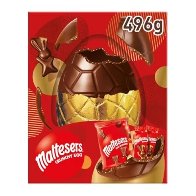 A Giant Easter egg with a yummy Maltesers milk chocolate shell and packed with Malteser Bunny treats. Time to get egg-cited! Master of the Easter egg hunt this year? Whoever finds this chocolate Easter egg is going home happy. You could even gift this Easter egg to a chocolate lover, add to an Easter hamper or share this Easter treat with friends and family. This Easter egg carton is fully recyclable. To recycle the foil, ask at your local recycling centre A hollow milk chocolate Easter egg with two 29g Maltesers Bunny’s and one 58g pack of Maltesers Mini Bunnies. Total weight 496g. Suitable for vegetarians.