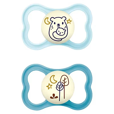 MAM Air Night Soothers 16+ Months (Pack of 2), Glow in the Dark Baby with Self Sterilising Travel Case, Newborn Essentials, Blue, (Designs May Vary)