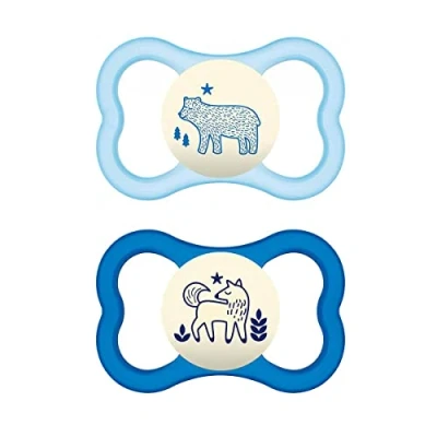 MAM Air S231 Pacifier Shield with Extra Large Holes For Sensitive Skin, Skinsofttm Ultra Soft Silicone Nipple, Babies 6+ Months, Blue, Self Sterilizing Box, 2 Units